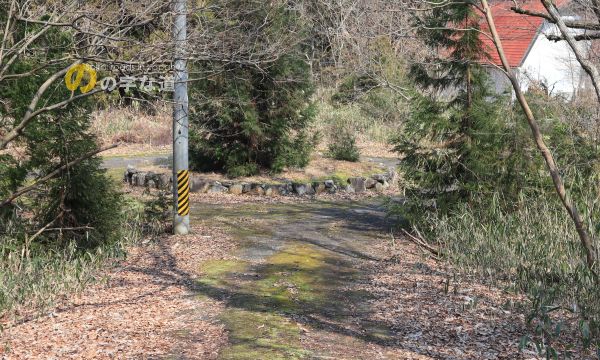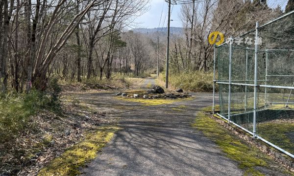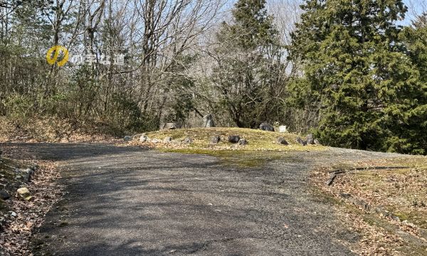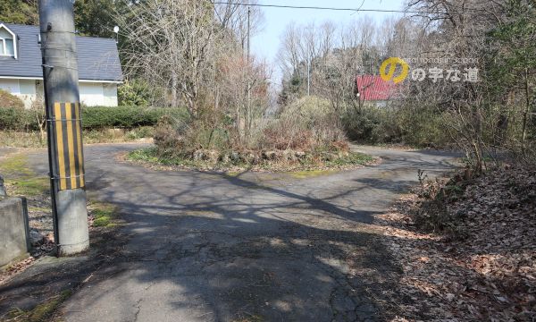 東側から。いずれの接続路にも(もとより、別荘地内の全円形交差点に)警戒標識「ロータリーあり(201の2)」は設置されていない。