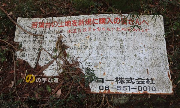 敷地内に倒れていた看板。電話番号から調べてみたら、2018年頃まで大阪市大正区で不動産事業を展開していたサンコーという会社名が記されている。東宝ランドと共同で開発し、サンコーの持ち分が若葉台という名で分譲されたのか、びわこ台の一部区画を若葉台という名称で再販していたのか、今となっては調べようがない。