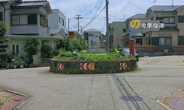 西側から眺める。シェブロンで右回りを誘導しているが一方通行の規制はなく、警戒標識「ロータリーあり(201の2)」も設置されていない。