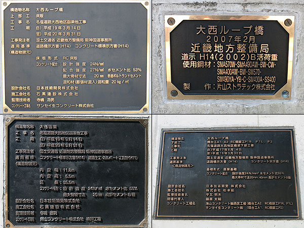 名塩道路全体としては継続事業中だからか、名塩工区自体まだ工事中なのか文献を確認していないが、大西ループ橋の橋歴板は取り付けられているものの橋名板はまだ嵌められていない。