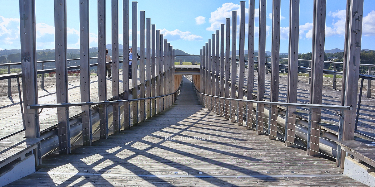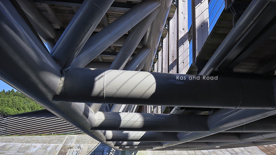 上弦材側と下弦材側のいずれの床版も南三陸産のスギ材を使用しているとのこと。下弦材側通路は上弦材側通路の下に潜り込んでいるので屋根付橋と言えそうだ。
