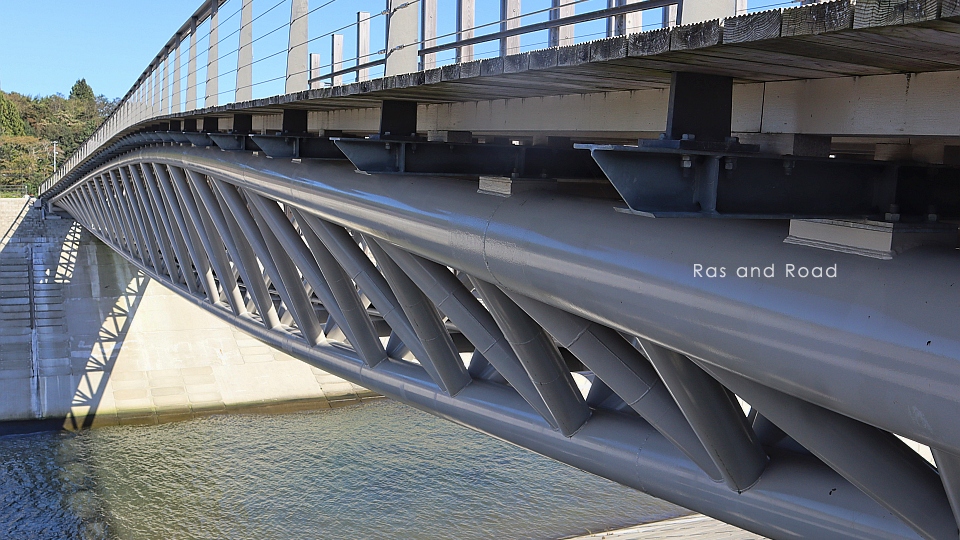 このような構造形式を調べる過程で、すんぷ夢ひろばの弁天橋(静岡県静岡市)がレンズ型スペーストラス(上路式曲弦トラス or 三弦レンズトラス)という似た形式と知った。