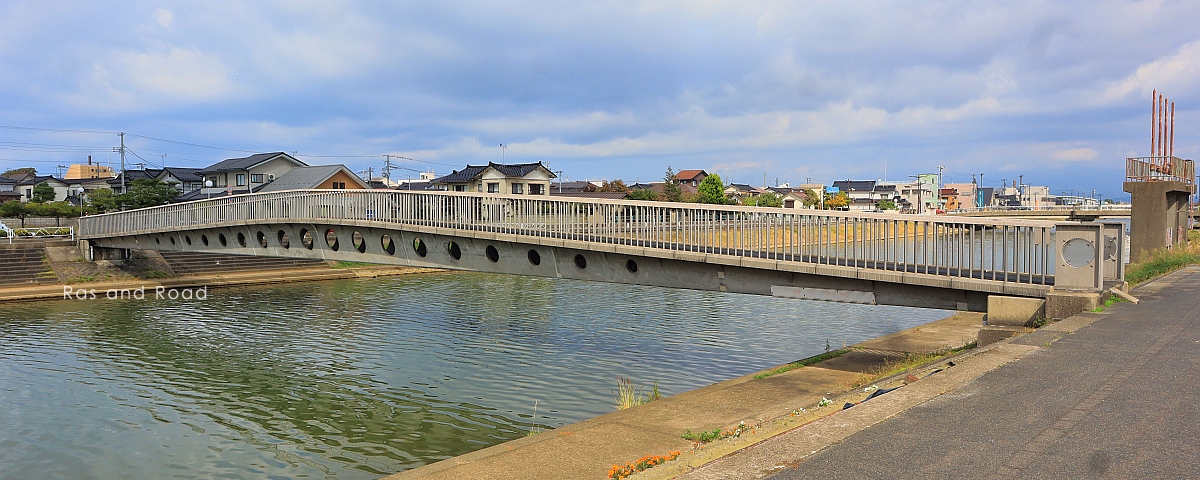 この橋を撮影するときの正しい方向・構図。というのも、この橋は大成建設及び太平洋セメントと、背後に写る前田製管の3社共同プロジェクトで架設されたことにある。