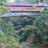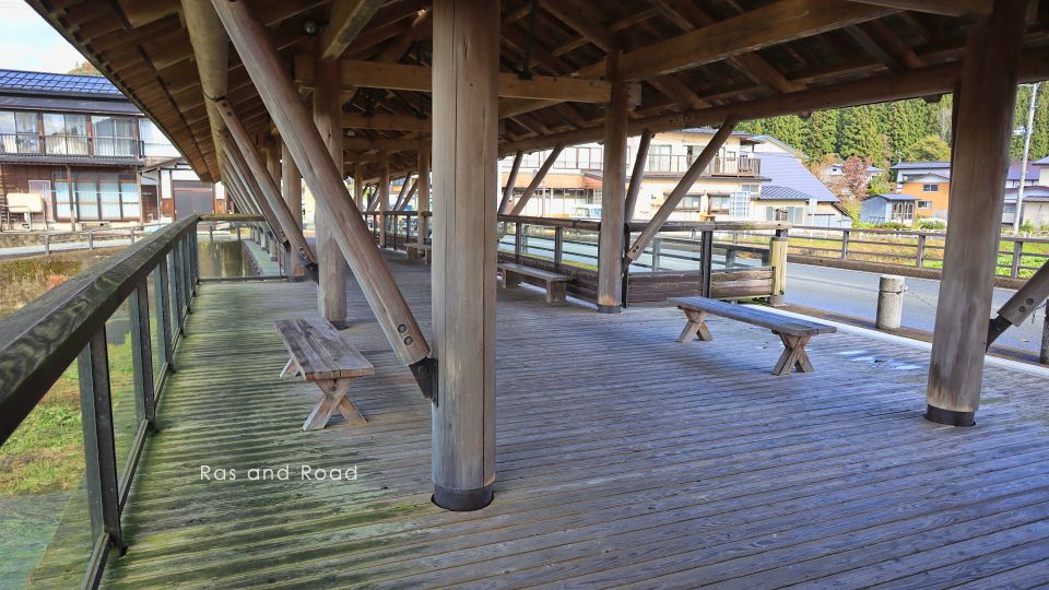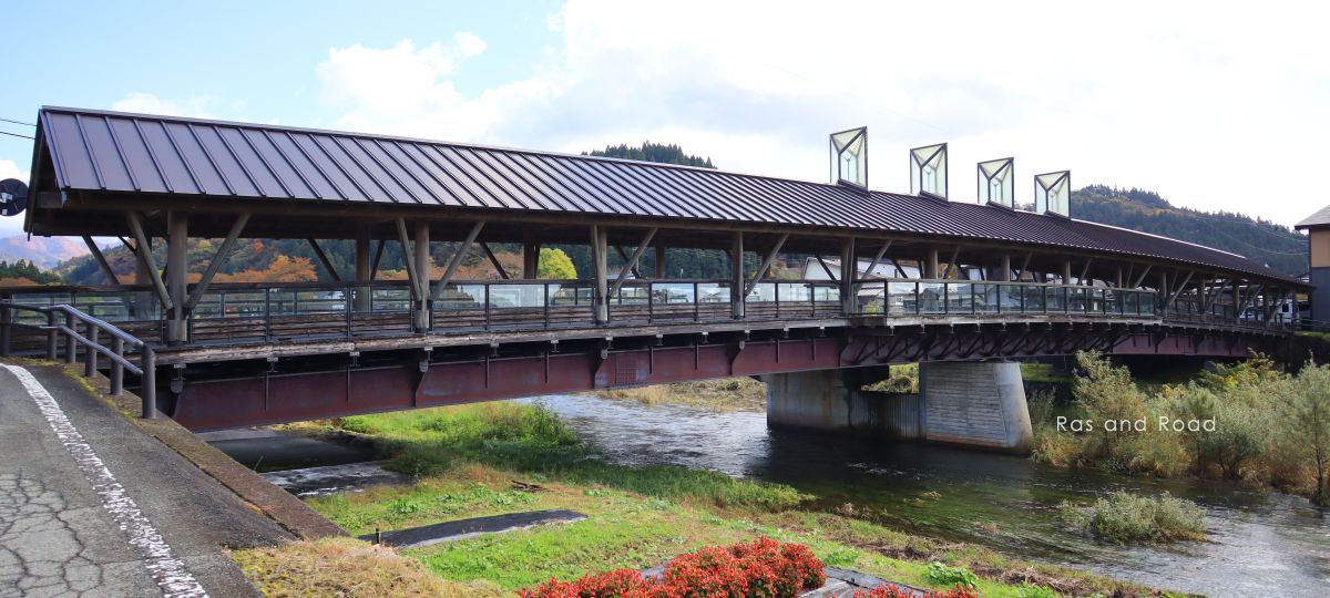 高欄はポリカーボネートだろうか、屋根付橋なのに開放感がある。ベンチも同じ木材で造られているところがいい。