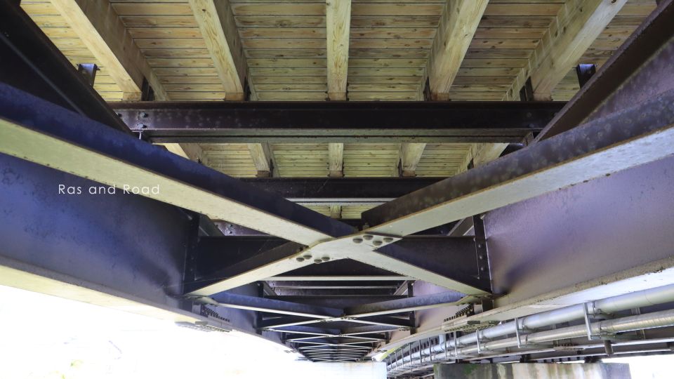 耐候性鋼材のおかげで目立たないが、バリバリの鋼橋である。横桁が剥き出しというのは珍しいが、なんとなく木橋の雰囲気を強調しているように見える。
