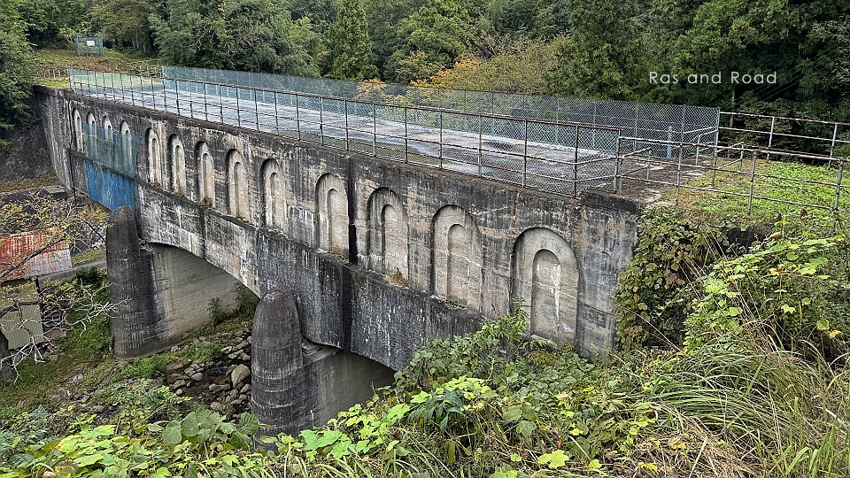 1938(昭和13)年完成、橋長43mの3径間RC桁橋。トンネル部分の水路横断面は幅5.5m高さ5.5mの馬蹄形とのことだが、水路橋部分の横断面は関係資料に記述なし。土圧がかからない状態で馬蹄形にする必然性はないから四角だと思う。