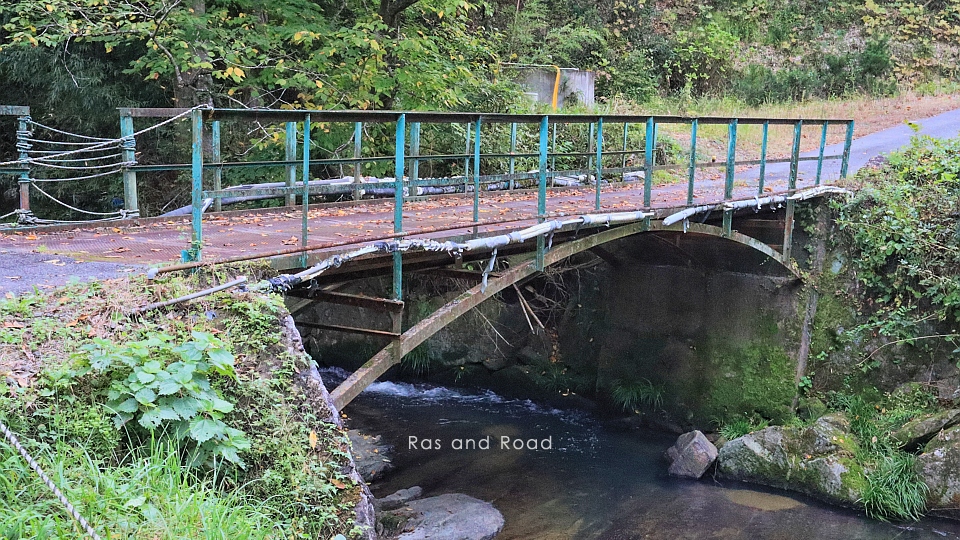 水路橋のすぐ上流に架かる鋼アーチ・パンチングメタル床版の点検用橋梁。