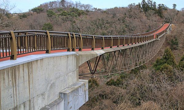 いわき市の南東、いわきニュータウン内に整備された いわき公園 内の神下堤(かのりつつみ)に架かる 外ケーブル併用吊床版橋。