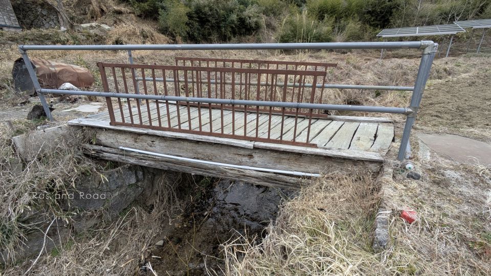 単管パイプの高欄に目が留まり、近づいてみたら木橋だった。帰宅後に調べてみたら9061号線という市道だった。いろいろ「えぇー?」と唸る橋だ。市道と言っても二輪車以外の車両通行は不可能、道の奥には民家が1軒あるのみで、限りなく自家用橋に近い。