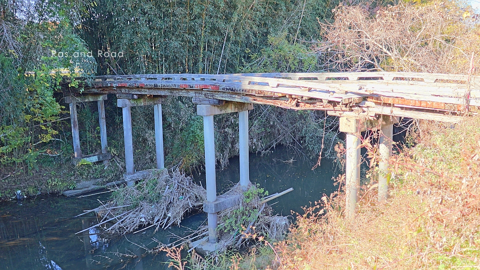 1本上流の橋・川原橋を経由して対岸へ回って接近してみて、歩いて渡らなくて正解だったと知る。行桁が腐朽して折れている。