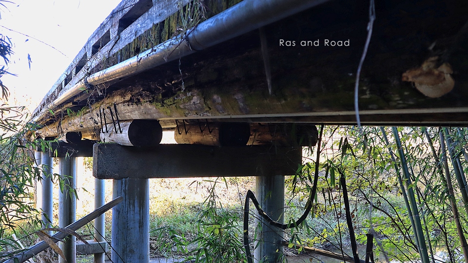 行桁は3本の丸太で構成され、肘木の上で繋いでいる。添架されている管は農業用水か?
