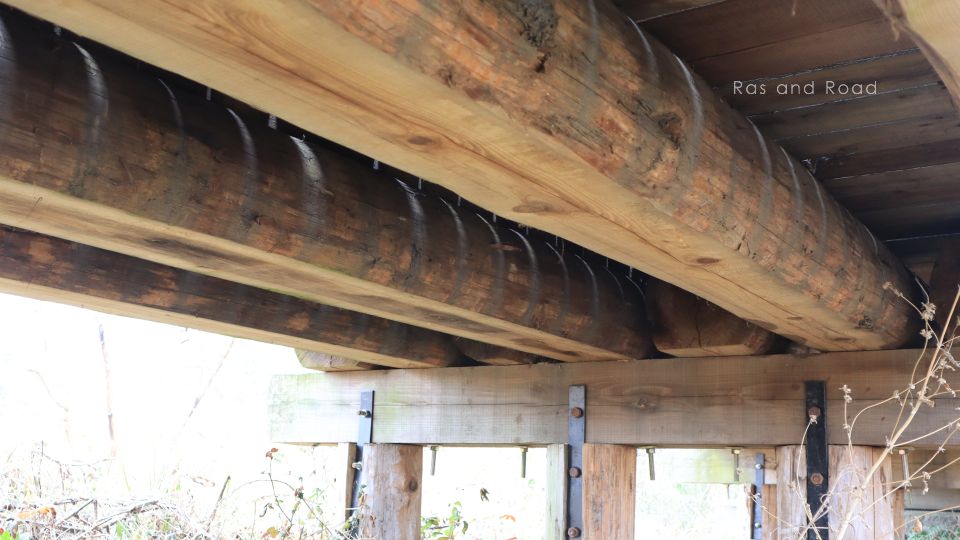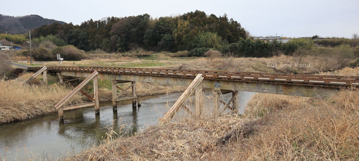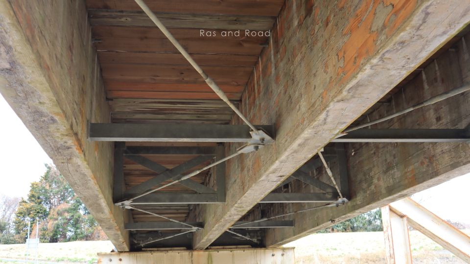 河原部分の桁は渡河部分とは異なり、昔ながらの丸太を並べる形式だ。