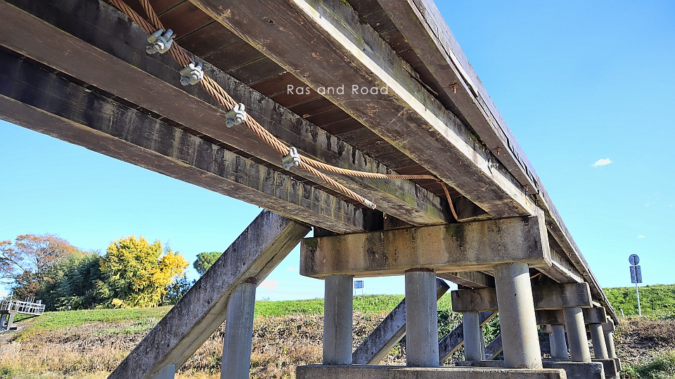 行桁を斜めにすることで、肘木なしで細い橋脚梁に確実に乗せている。なるほど。桁厚を最小限(桁下高さを最大限に確保しつつ、橋面と前後路盤の高さを最小限)にするとともに、一部の桁だけがずれることを防ぐための工夫だ。上部工の縦断面を小さくできれば、増水時の抵抗が減るので橋が流れる事態も減る。流れても回収できるようにワイヤーで繋がれている。