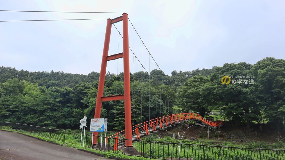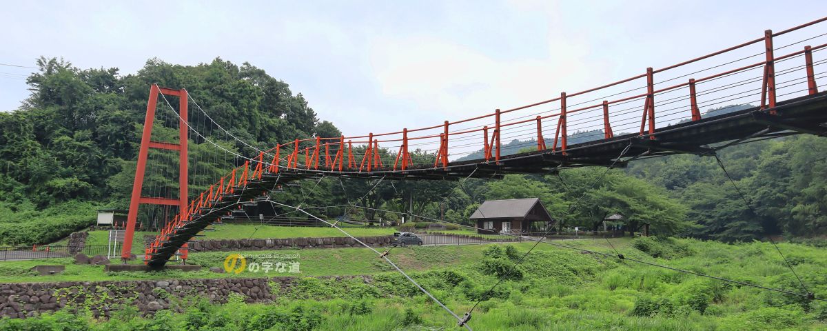 1994(平成6)年3月完成の単径間片塔式ウェーブ吊橋。吊橋主塔が右岸側1本で、左岸側の桁半分ほどが吊床版橋構造になっている。