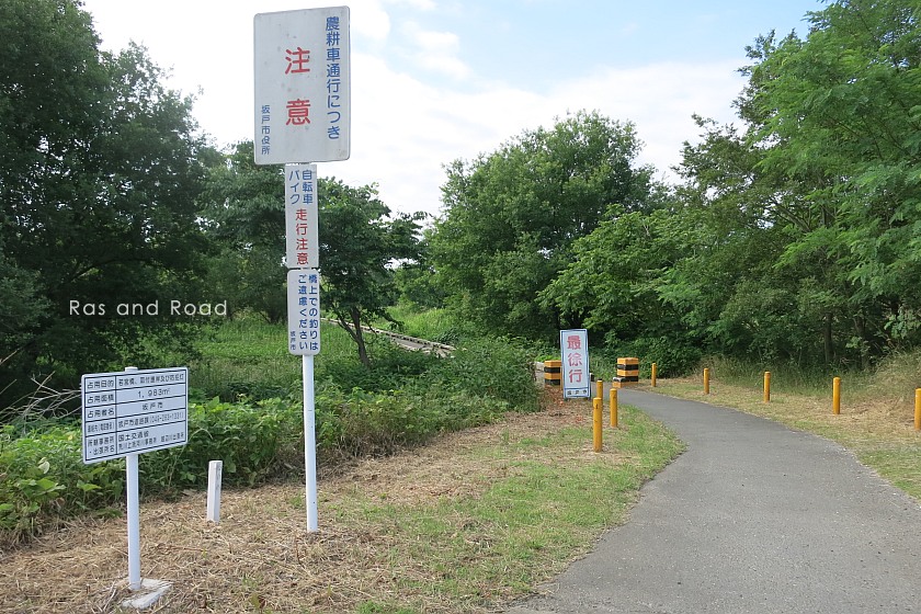 橋の幅員は2.2m、直前にはコンクリート製の障害物が橋とほぼ同じ幅で設置されている。