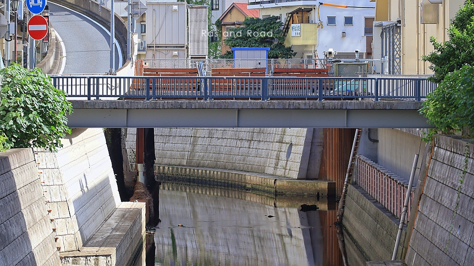過去の空中写真を見比べると、先代は古川に直交していたが現橋は北詰の橋台位置が3mほど西に移されて古川に斜交している。首都高速2号目黒線の橋脚位置を調整できなかったのだろう。