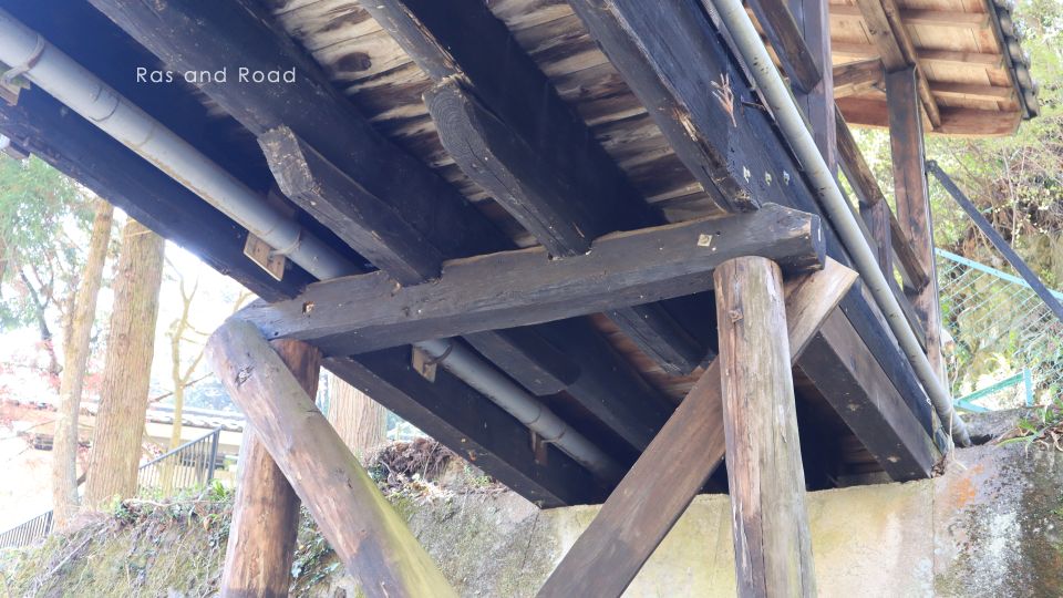 桁下に潜ってみると完全なる木橋構造。添架されているパイプは桁の外側が水道管で内側は下水管だろうか。