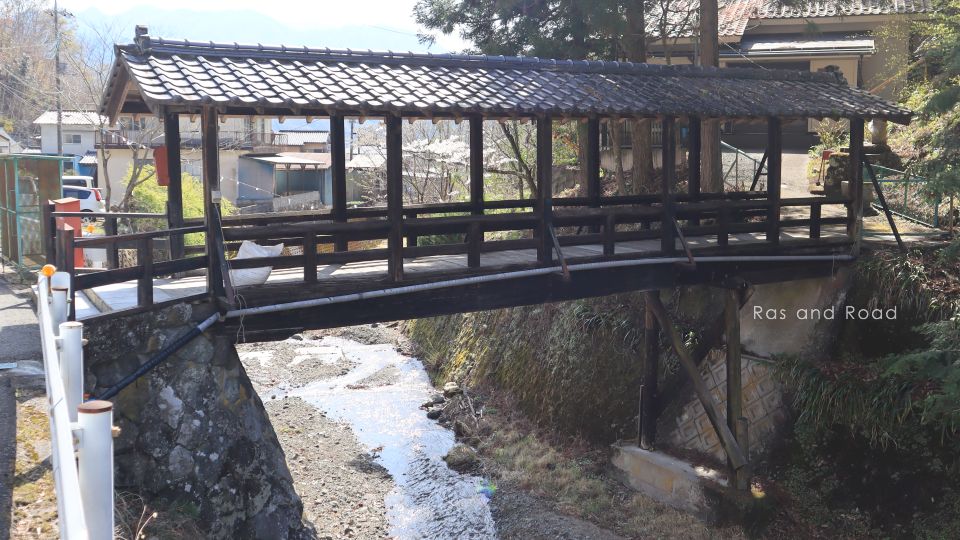 いつ頃架けられたか、昔から屋根付橋だったか、近所の人に尋ねたかったのだが、あいにく誰も歩いていない。橋上の梁に橋改修工事費の奉納札が掛けられており、そこには鰍沢地内にある柳澤建設の社長と思われる名が記されている。就任期間から考えて改修工事は平成前半に行われた可能性が高い。