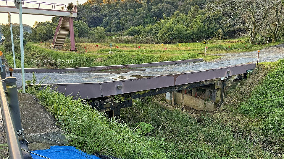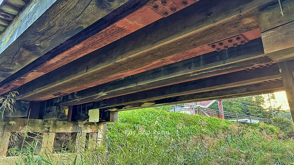 下に潜り込んでみたら、なんと縦桁に木材とH形鋼を交互に配置するハイブリッドだった。こんな構造の橋は初めて見たが、致命的な落橋は発生しにくく意外に合理的かも知れない。