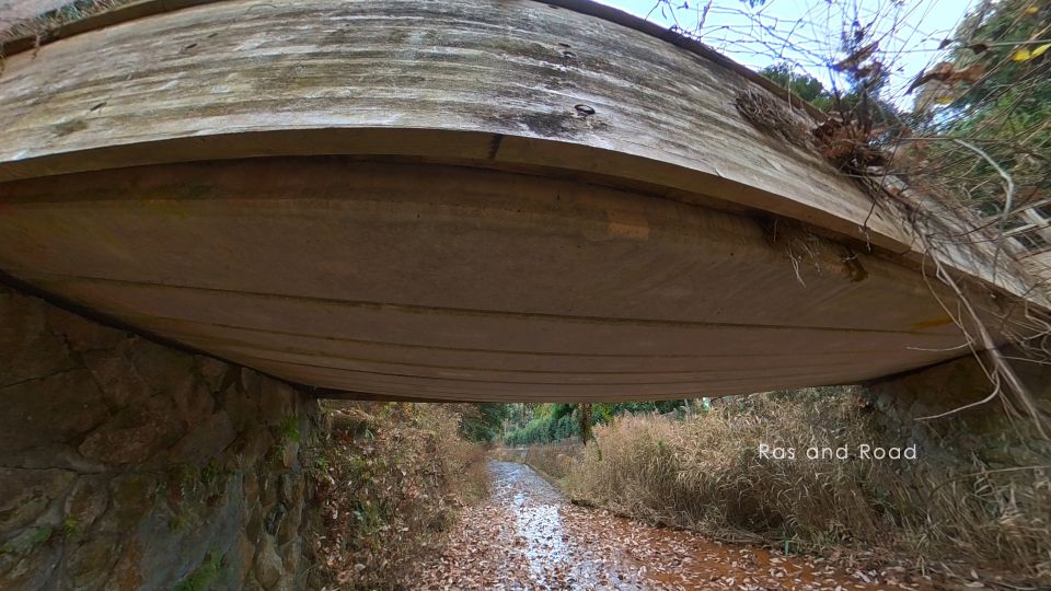 左岸側から眺める。高欄の状態は健全に見えるが、地覆がかなり腐朽している。腐朽の原因は濡れ落ち葉だろうか。