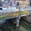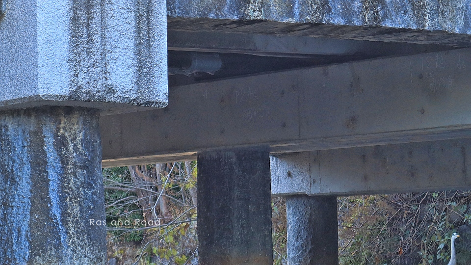 桁下を覗くと、両側主桁は石材であること、RC行桁と耐震補強工事で取り付けたであろう落橋防止装置が見える。現場では橋脚に何かの文字が刻まれていることは識別したものの文字は判読できなかった。橋脚梁の「P2起 補修済」はよく読めるのだけれど。