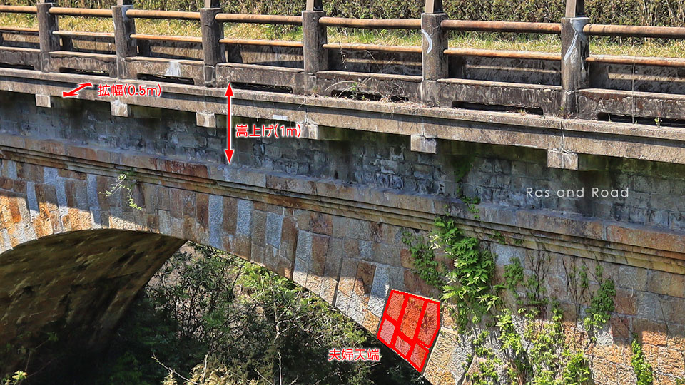 夫婦天端とは聞き慣れない用語だが、輪石と布積みの壁石を摺り合わせる方式で五角天端や三角天端と呼ばれる方式の一種らしい。つまりは凸凹しているから「夫婦」なのだろう。1933(昭和8)年、京都国道改良工事により路面の嵩上げと拡幅が施工された。