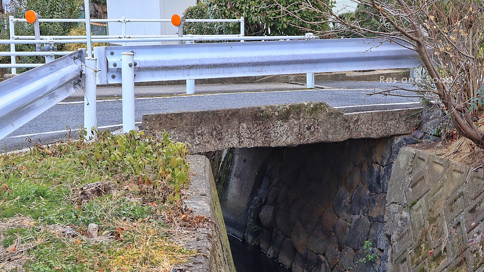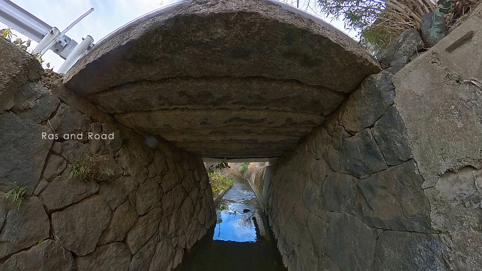 8本の石桁が並び、奥(北側)には後年に拡幅されたであろうRC桁が見える。石橋はかなり古いことは容易に想像できるが、いつの時代のものかを言い当てることは難しい。江戸時代後期だろうか。