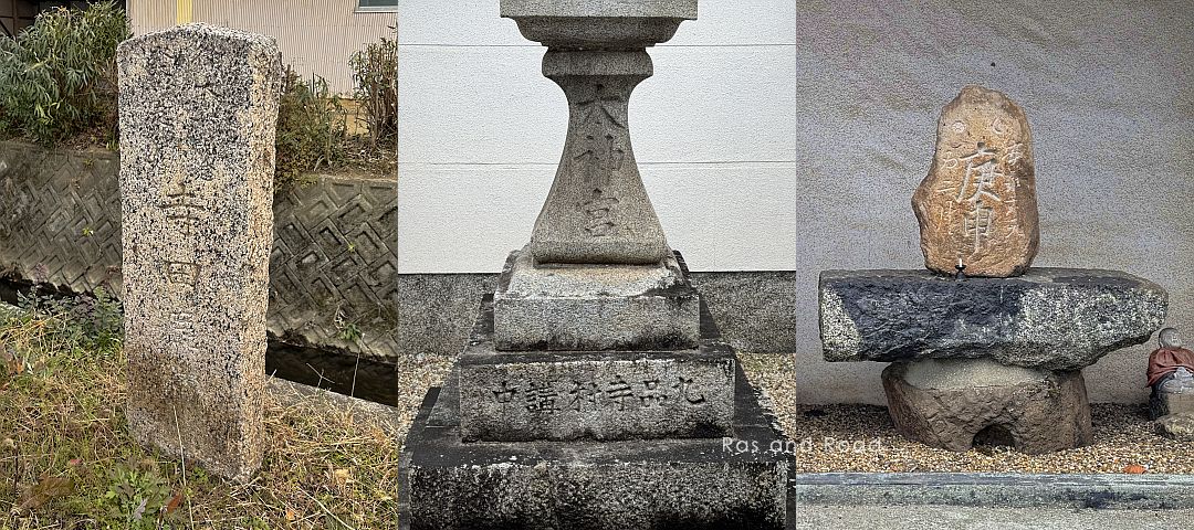 右:常夜灯の横に置かれた庚申塚。「安永●● ●二月」の●が簡単な字ではあるが判読できない。安永は1773年1月から1781年4月。