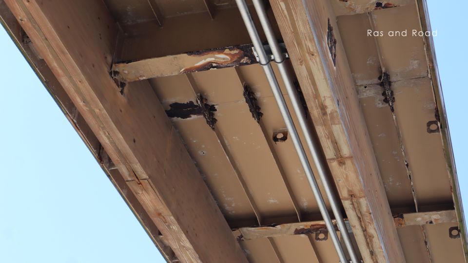 完成から18年、海風に晒され、冬季は凍結防止剤が舞い上がる場所なので、この発錆は当然だろう。