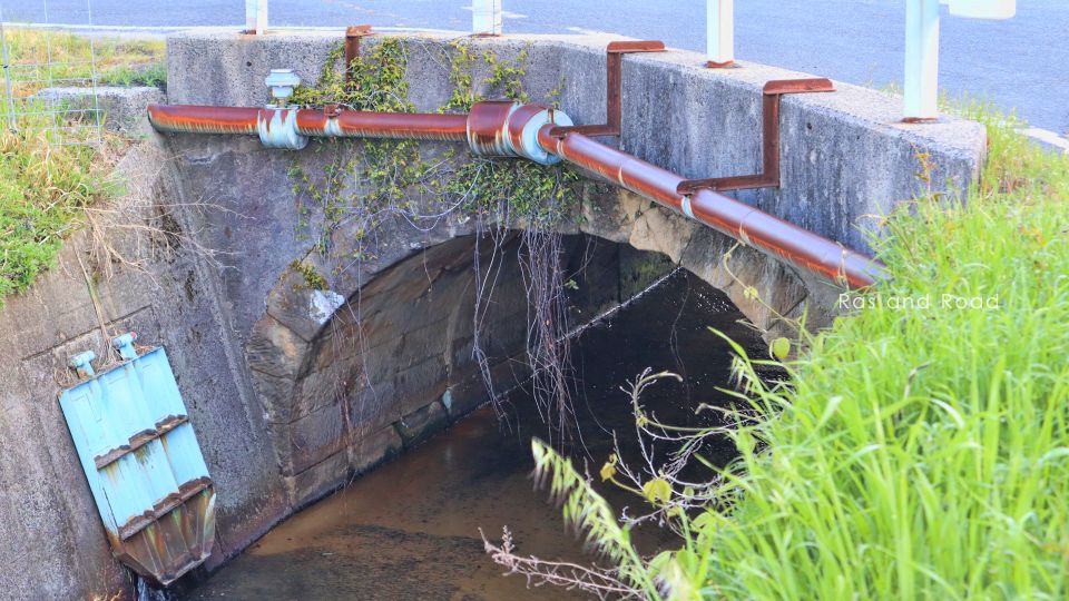 元々は幅員2.4mほどの石造アーチ橋で、まず1m強の拡幅をRCアーチで(昭和初期か?)、その後4mの拡幅(昭和中期)を1回目の拡幅に合わせるように、さらにPC床版で線形改良の拡幅(平成)、と3段階で施工されたと見る。つまり市資料の1959(昭和34)年完成は2回目の拡幅工事を指していると思う。