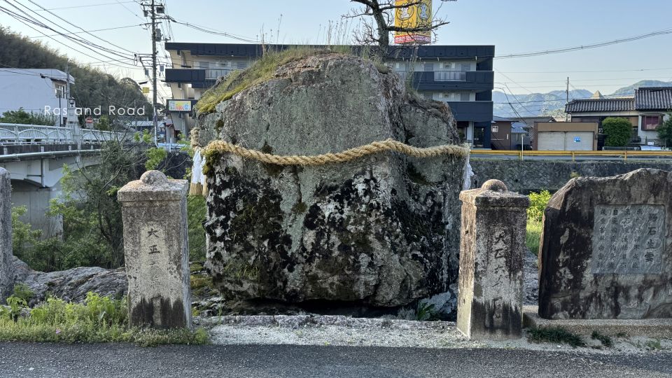 橋の脇には橋名の由来になった鰐石の重ね岩がある。その前にある門柱のようなものは先代RC橋の親柱だろう。