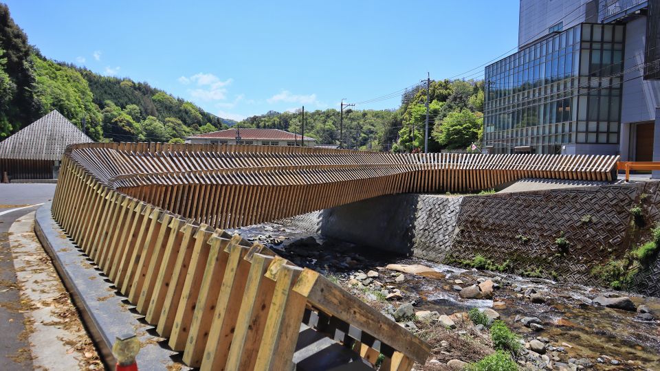 橋の前には日本酒「獺祭」で有名な旭酒造があり、橋の対岸にある同社直売所の設計を委託した縁で久杉橋のデザイン監修を隈研吾建築都市設計事務所に委託、修景にかかる費用を同社が負担したそうだ。