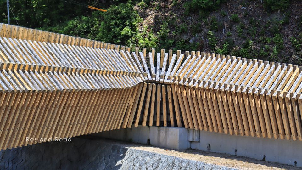 また、高欄に相当する部分には1266本の県産ヒノキ材を組み合わせており、ヒノキ材には有機無機ハイブリッド樹脂塗料を塗装したとのこと。完成から3年近く経って訪問したわけだが、木材表面の一部は塗装が剥がれたように見え黒いシミが点在していたが、想定された変化なのだろう。橋の寿命は60年とも100年とも言われる。まずは20年後、この橋がどうなっているか楽しみだ。