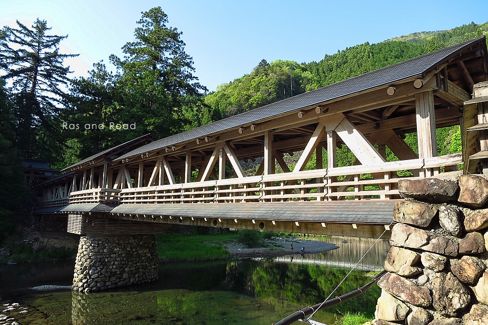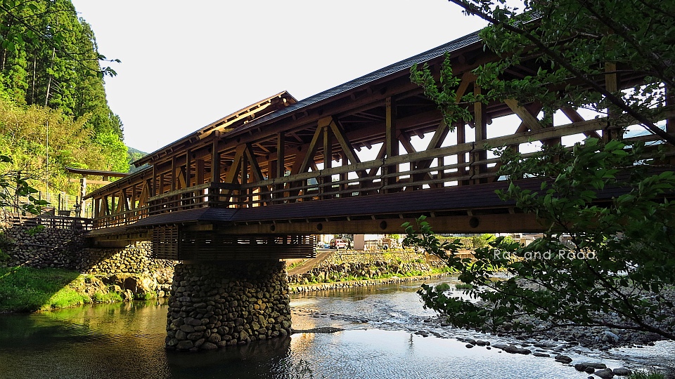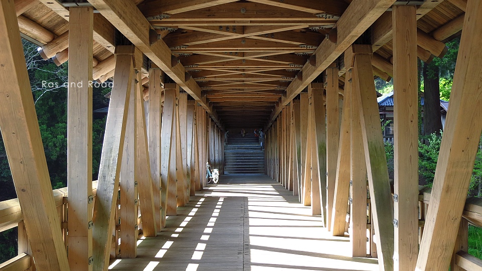 2002(平成14)年3月完成、橋長52mの下路式2径間連続木造ワーレントラス橋。