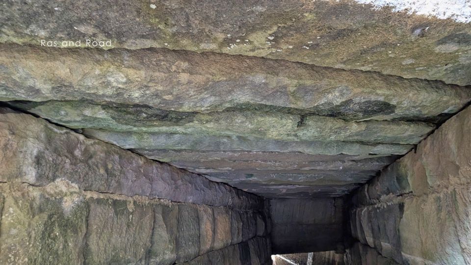 桁下を覗き込むと、およそ15本の石桁が並んでいた。自動車または荷馬車が通行する前提だったと考えられる。参考資料1によれば、この付近にいくつかの石切場があり、安山岩や玄武岩が帆崎石や小長井石として出荷されていたとのことで、この桁もその石材が使われたと見てよさそうだ。