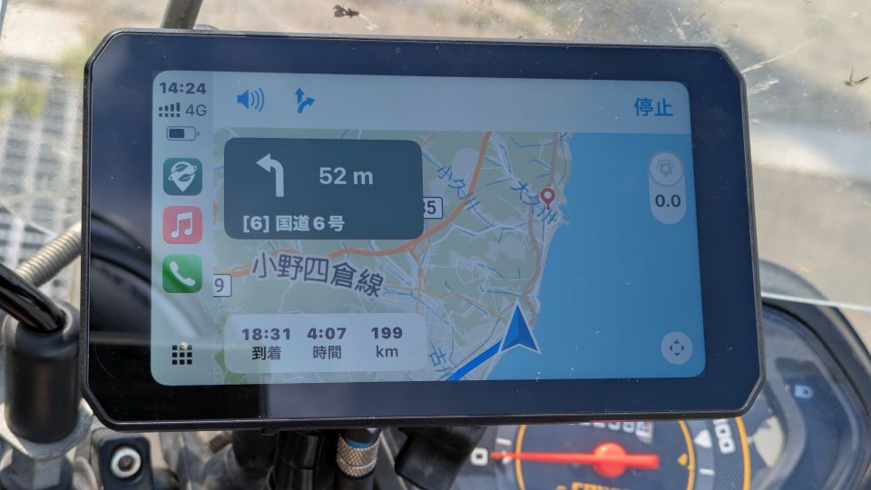 • スマホと接続するWi-Fiは2.4GHzよりも5GHzのほうが安定するが、5GHzはW56DFSモードなので1分間の待機時間が発生する。車両のキーをONにしてモニター電源を投入してからジャケットの前を閉じてヘルメットを被ってグローブを履いて、それでも待つ。まあ、ナビ画面が表示される前に走り出しても何ら支障はないけれど。