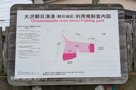 松前町の市街地少し東に位置する漁港。2015(平成27)年2月6日松前町告示第6号で第1種大沢漁港と第1種朝日漁港を統合した。