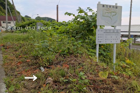 この位置に正規の漁港標識があったようだが、矢印の先に倒れて朽ちていた。