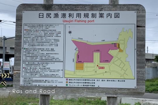 臼尻漁港で水揚げされた水産物の出荷は国道278号か高台に整備中の尾札部道路(国道278号バイパス)で運ばれるが、国道は狭隘、尾札部道路は高低差が50mあるため取付道路が急勾配であることへの対策として、臼尻漁港臨港道路が2021(令和3)年度に着工、2027年度完成に向けて施工中になっている。臨港道路が完成したら漁港標識が設置されるだろうか?