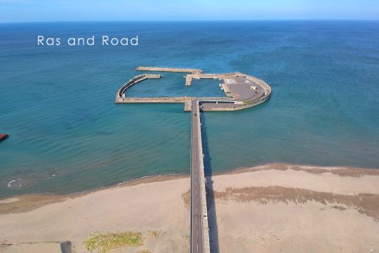 由利本荘市北部、旧岩城町の砂浜海岸に位置する漁港。第8次漁港整備長期計画により、1990(平成2)年着工、第9次漁港整備長期計画を経て2007(平成19)年完成。日本では数少ない「ワイングラス型島式漁港」のひとつ。漁港と陸地を岩城アイランドブリッジ(2007年3月完成/橋長365m)が結ぶ。