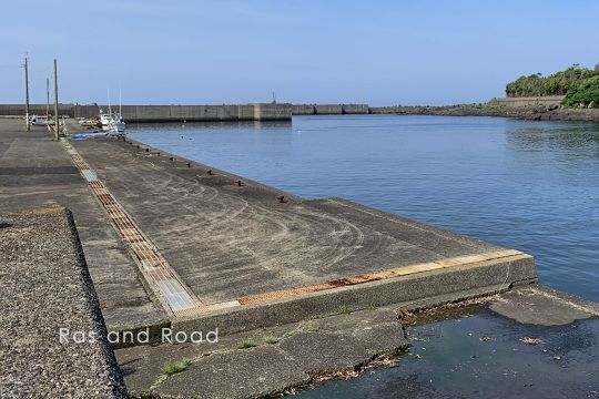 水成川と石垣川の河口に位置する漁港。南九州市の海岸は波食棚(波食崖)が作り出した独特の海岸線が続く。