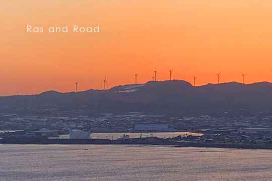 枕崎漁港(枕崎地区)夕景。番屋風力発電所が浮かび上がる。