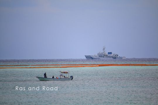 巡視船まつしまとODB(沖縄防衛局 Okinawa Defense Bureau)を掲示する漁船(警備船)が周辺海域を警備する。