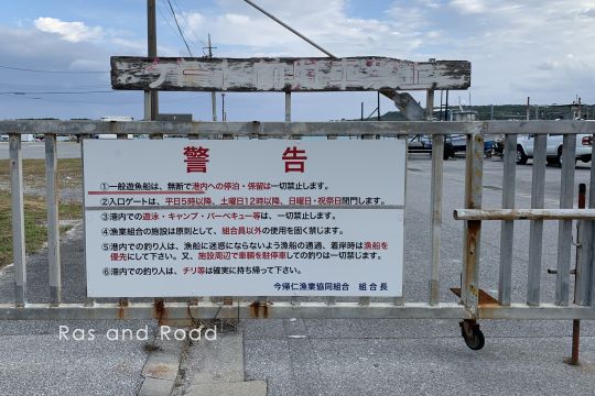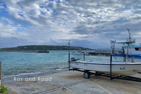 今帰仁村(なきじんそん)のウッパマビーチ、古宇利島を眺める位置にある漁港。ここが「運天漁港」であることを示すものはない。