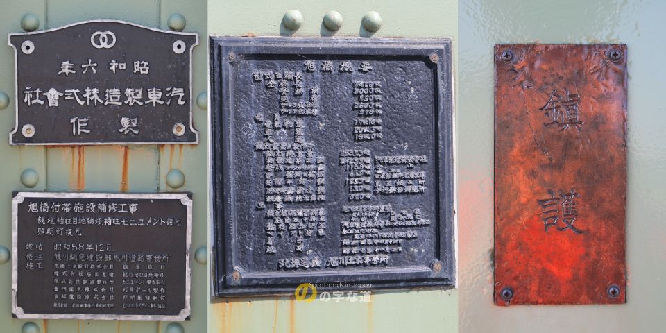 見慣れない銘板が色々と。工事銘板の「昭和六年」は桁の完成時期だろう。