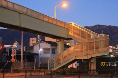 市立別府中央小学校(旧 市立北小学校)前の国道10号に架かる横断歩道橋の西側昇降階段がループしている。市立北小学校はかつて別府タワー近くにあったが1985(昭和60)年2月に現在地へ新築移転した。移転開校に合わせてこの横断歩道橋が架設された...