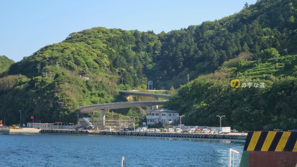 知夫里大橋全景。フェリーターミナル絶賛建設中のため、橋をうまく見通せなかった。だが、この足場の状況から推測するに、新ターミナル完成後も橋をうまく見通せないかも。