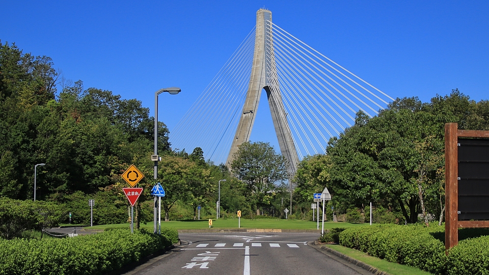 東側接続道路から眺める、日常へ引き戻される風景。豊田アローズブリッジの大きさが際立ち、これはこれで爽快感がある。