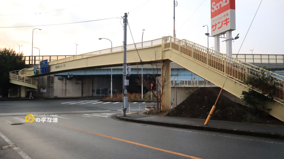 香住ヶ丘歩道橋全景。分岐するバイパスを旧道が迂回するため道路幅が広いからか、横断歩道はない。