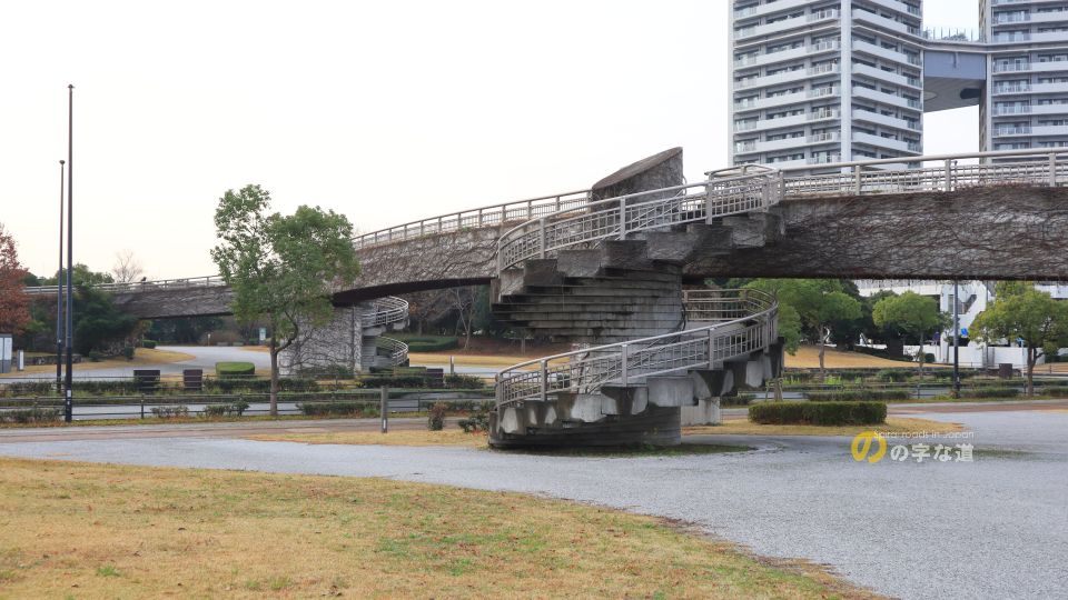 福岡アイランドシティは、1994(平成6)年7月埋立工事着工、2003(平成15)年コンテナターミナル供用開始、2005(平成17)年から順次入居開始となった。その「まちづくりエリア」(住居・公園地域)の中央部に設けられた都市公園にある横断歩道橋の両端がループしている。市港湾空港局アイランドシティ事業部は「ぐるりん橋」と呼んでいるが、現地に橋名を示すものはない。